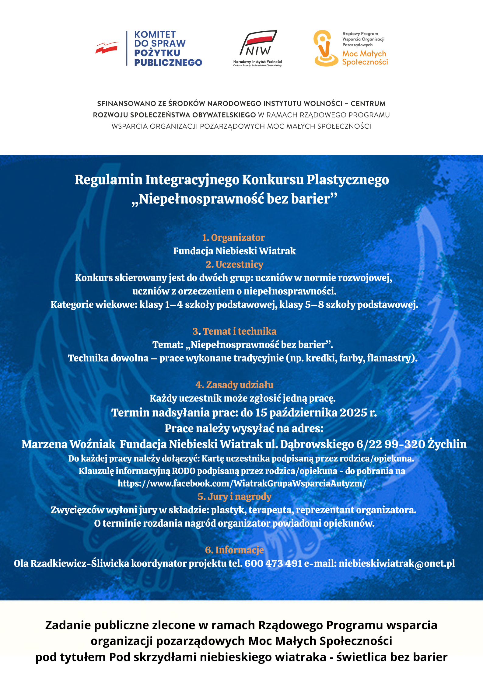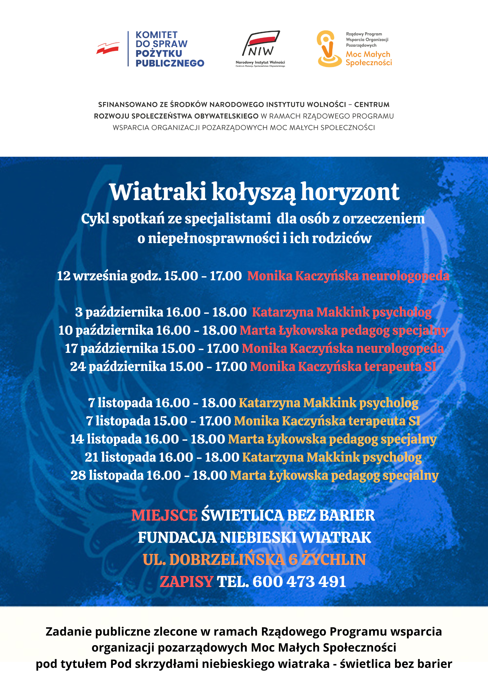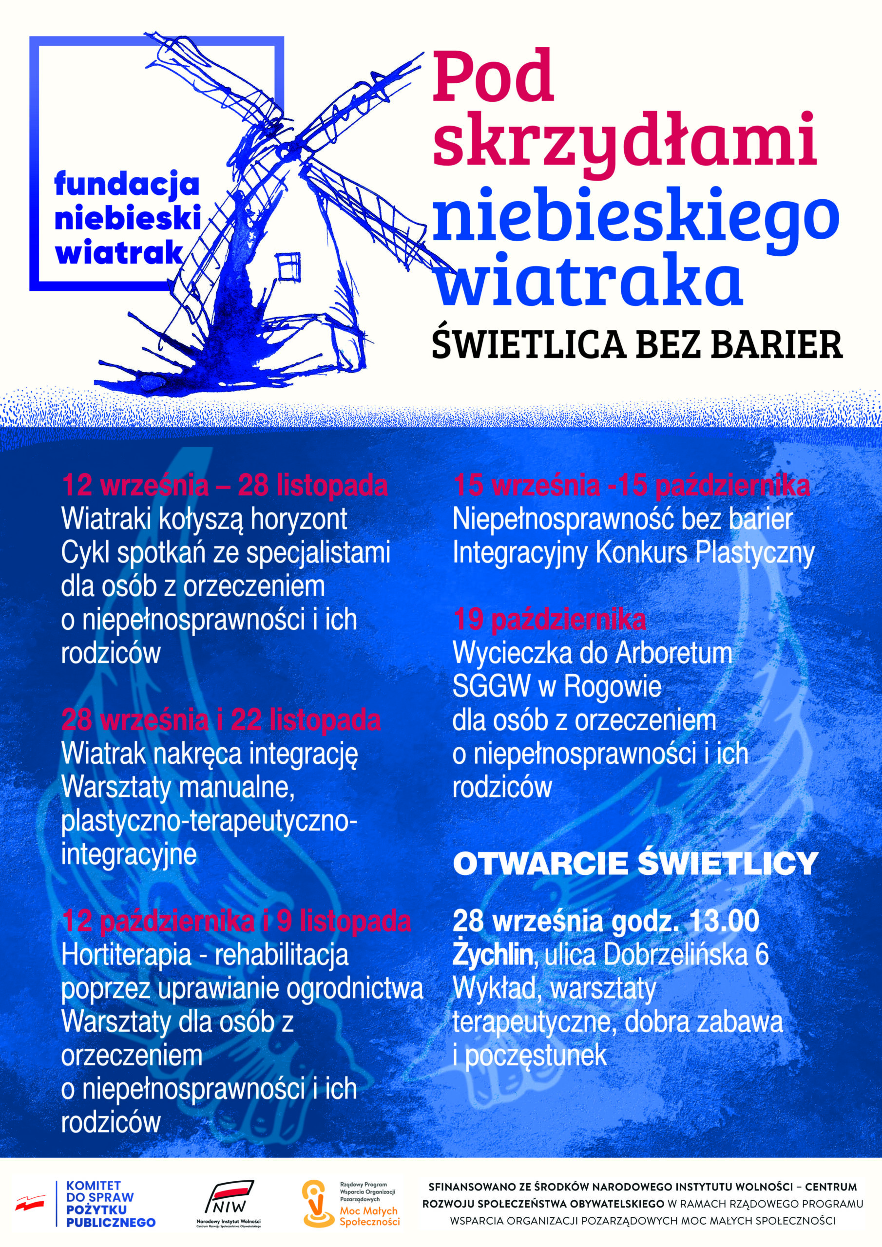 Fundacja Niebieski Wiatrak realizuje Zadanie publiczne zlecone i sfinansowane w ramach Rządowego Programu wsparcia organizacji pozarządowych Moc Małych Społeczności pod tytułem Pod skrzydłami niebieskiego wiatraka – świetlica bez barier. Wykład warsztaty i nagrody zostały sfinansowane z Rządowego Programu wsparcia organizacji pozarządowych Moc Małych Społeczności.